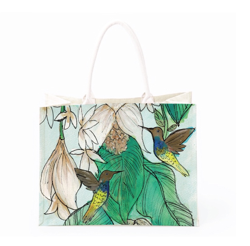 ลวดลายบนกระเป๋าเป็นภาพนก Ornate Sunbird สองตัวท่ามกลางดอกไม้บานสะพรั่ง สื่อถึงความสุข อิสรภาพ และความงดงามของความแตกต่าง